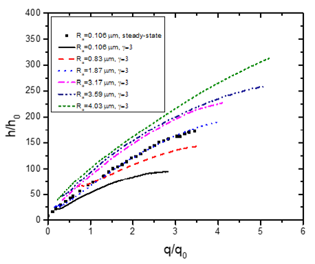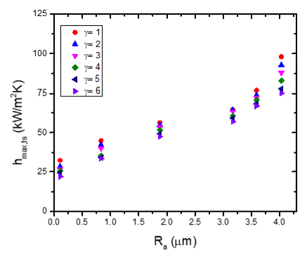 The hmax,ts for the samples of Ra=0.106 μm, Ra=0.83 μm, Ra=1.87 μm, Ra=3.17 μm, Ra=3.59 μm and Ra=4.03 μm during rapid transient of γ=6 is decreased by 31.99 %, 24.77 %, 15.42 %, 6.54 %, 12.71 % and 23.26 %, respectively, from hmax,ts obtained during slow transient of γ=1. Non-dimensional h and non-dimensional q are estimated from the reference value of h0 and $q_{0}^{\prime \prime}$ as given in Eq. (5).