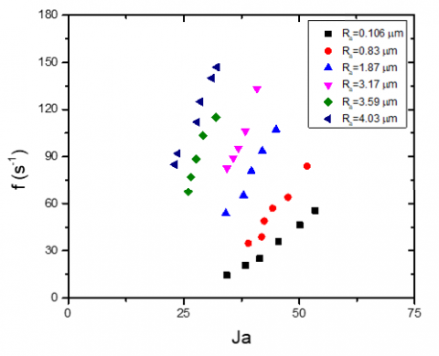 Bubble departure is identified in the recorded videos and the relevant image is selected. Image processing is carried to measure the vertical and horizontal length of the bubble meniscus. The average of that is considered as the equivalent bubble diameter. Thus bubble departure diameter of each sample for different heat flux is given in Figure 17. It is observed that bubble departure diameter significantly increases with increase in surface roughness. As discussed in Walunj and Sathyabhama [16] the absolute cavity depth (Rz) and average roughness value (Ra) increases with larger grit sandpaper. The radius of bubble nuclei increases with increase in cavity mouth size. Hence it is observed that rough sample can generate larger bubble. Bubble frequency is estimated by considering bubble growth period and waiting time between two consecutive nucleated bubbles from the same site. Compare to smooth surface, unidirectional scratches facilitate the improved liquid supply as each scratch will act as a liquid feeder tube to the growing bubble. This mechanism reduces bubble growth period. Capillary wicking is the ability of the liquid to flow through the narrow passage without external force due to presence of adhesive forces between liquid and solid. It plays vital role during each bubble cycle. The quick liquid replenishment takes place on the departure of bubble. Fraction of vapor entraps in the cavity as liquid exerts capillary force on the bubble neck. This dynamics becomes rapid with increase in surface temperature. Thus waiting time between two consecutive bubbles at the same nucleation site reduced with increase surface roughness. The variation in the bubble frequency with Ja is shown in Figure18. The bubble frequency increased due to reduction in the bubble growth period and bubble waiting period.