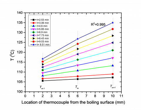 The assembly of test section is considered as the axisymmetric system. The uniform heat flux from the boiling surface is assumed due to uniform surface characteristics. The sample of temperature readings of Ra=1.87 μm at the different time of acquisition is presented in Figure 4 which shows the temperature distribution obtained by implanted thermocouples. It is observed for all the samples that temperature distribution exhibits a linear fit for each set of readings. The R-squared value is close to unity.