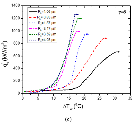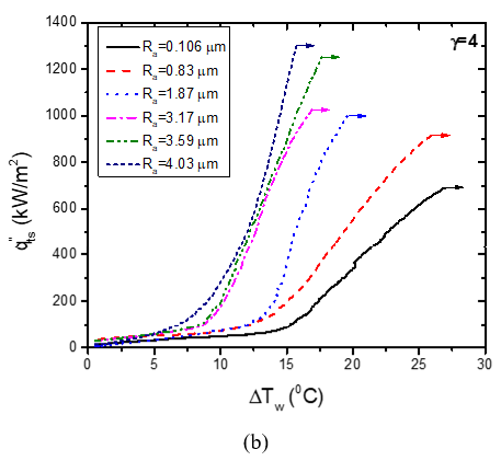 The effect of surface roughness on the boiling heat transfer at different γ is extensively studied. The boiling curves obtained during γ=2, γ=4 and γ=6 at different Ra are plotted in Figure 6 (a), (b) and (c), respectively. It is observed that heat transfer augments with an increase in Ra for each γ. The nucleation sites have drastically increased due to increase in Ra. The surface wettability improved due to capillary wicking through the unidirectional scratches. The improved liquid supply to the nucleation site has augmented the heat transfer