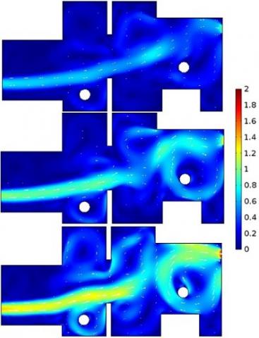 Figure 15. Velocity fields affected by the pollutant concentration levels of 0.1, 0.5 and 1.0 mol.m-3