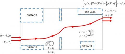 This article studied the combined pollutant concentration dispersion and convective heat transfer in the two-dimensional factory model (Figure 1). The CO2, contaminated in air, is emitted from high fixed temperature furnaces. Moreover, the factory is affected by the convective heat transfer at the inlet of the factory.