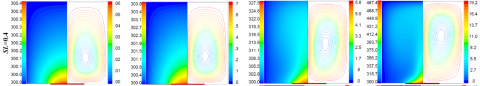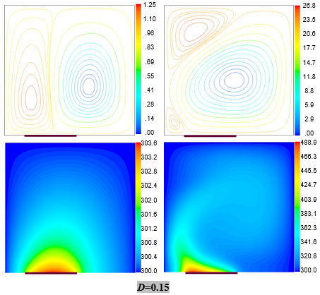 Figure 7 shows the temperature velocity fields for the T-imposed heating type, where the source is under the constant temperature TH. Only six cases were presented, where two values were taken for Ra, 10+4 representing a low temperature dependence of the density and 10+6 for the opposite case, and three SL values ranging from the smallest (0.1) to the longest one (1.0) through an average length (0.4).