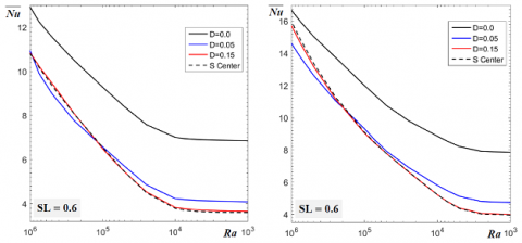 The curves of the latter shown in Figure 11, show that the maximum exchange is for D=0.0 for all simulated SLs and for both types of heating. Not only this, but its value is significantly higher, which offers a result of great practical importance. It is thought that it is because of the location of the source in contact with the left side wall under TC that the exchange has improved. Moving away from this wall, the rate will gradually decrease when D increases, where it is observed that the classical case with source in the center of the lower wall leads to the lowest heat exchange rate. The improvement of $\overline{N u}$ with the displacement towards the cold side wall is valid mainly. Some cases with strong Ra are exceptions without expected way. It is thought that this is because of the perturbations observed in the fields of velocity and temperature. But, the case at D=0.0 remains the best regardless of Ra and/or SL.