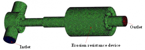 The novel erosion resistance device can alleviate the erosion effect of the fluid medium on the outlet wall of the throttle valve, after being connected to the valve outlet. The previous literature has merely analyzed the flow field of the throttle valve. There is no independent research that tackles erosion resistance device. Using the three-dimensional (3D) flow field analysis software of computational fluid dynamics (CFD), this paper numerically simulates the flow field of erosion resistance device, and provides a theoretical reference for the field application of the device.