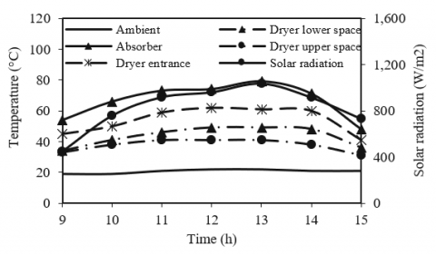 Figure 6 illustrates the performance of the proposed novel indirect solar dryer (NISD) on March 10, 2019 from 9:00 to 15:00. The temperature variations of the front, left, and right dryer internal surfaces were studied. As the cold air entered the drying chamber, it was heated by the drying chamber hot surfaces [23]. During the day, the maximum measured temperatures for the left, front, and right inside dryer surfaces were 74℃ at 10:00, 91℃ at 13:00, and 63℃ at 14:00, respectively. The left surface temperature reached its maximum value at 10:00 because the maximum incident solar radiation through morning comes from the east. The maximum front surface temperature was at 13:00 because the maximum incident solar radiation within the midday period comes from the south. The right surface reached its highest temperature at 14:00 when the sun moved toward west.