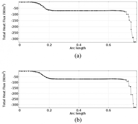 Figure 12. Total heat flux along heat exchanger, (a) disc-and-doughnut baffles, (b) 40% cut segmental baffles