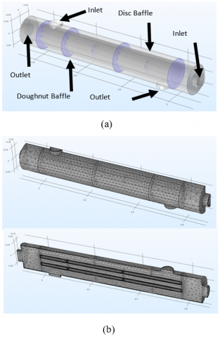 Figure 1 shows the position of the baffles and inlet - outlet of the shell and the tube, respectively. The geometry mesh is also shown in the figure. The sequence type of mesh has to be created using user-controlled mesh with element size of extremely-coarse and finer meshes to make accurate solutions that are calculated using numerical techniques. The extremely-coarse element size meshes are distributed along the volume of the shell and stationary-head. The finer meshes are distributed along the tubes and even finer close to sharp edges at the cross section of the baffles with tubes and corners. The free tetrahedral complete mesh consists of 294788 domain elements, 30682 boundary elements, and 4205 edge elements, with minimum and maximum element size of 3.78 × 10-4 m and 0.0035 m, respectively. Temperature, velocity, and pressure distribution are analyzed using COMSOL 5.2a. The calculation was solved using notebook with Intel® CoreTM i7 Processors, 10th Generation, 4.50 GHz, 16 GB of RAM. The total calculations time of 32 variations study case need 39 hours.
