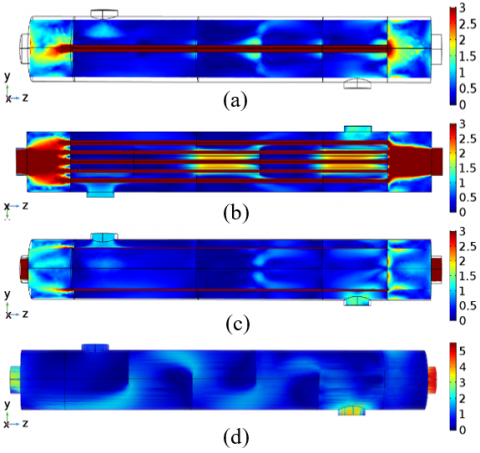 The velocity of water (inlet) in shell side are 1, 3, 5, 10 m/s and tube side are 1, 3, 5, 10 m/s. To simplify, they are grouped and named with first and second numbers. The first numbers are the velocity of water entering the shell inlet, and second numbers are velocity of water entering the tube inlet. The legends used in Figure 9 and Figure 10 are Shell 1-Tube 1, Shell 1-Tube 3, Shell 1- Tube 5, Shell 1- Tube 10, Shell 3- Tube 1, Shell 3- Tube 3, Shell 3- Tube 5, Shell 3- Tube 10, Shell 5- Tube 1, Shell 5- Tube 3, Shell 5- Tube 5, Shell 5- Tube 10, Shell 10- Tube 1, Shell 10- Tube 3, Shell 10- Tube 5, and Shell 10- Tube 10.