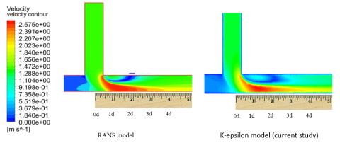 Figure 13 is a comparison of the magnitude of velocity contour of the Ref. [21] with the RSM-EB model and the k-ε model of the current study. The RSM model showed a sharp velocity contour that looked like a turbulent wave while the k-ε model showed good similarity, its velocity contour was dispersed with lacked the turbulent detail.