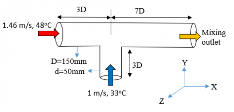 The model validation serves as an additional layer of quality assurance for the deployed methodology and adoption of the fit-for-purpose turbulent model. The first validation example was selected from Ming and Zhao [30]. In their paper, the RANS turbulence model was simulated with water as a working medium. The problem was an intersecting regular mixing tee, with the same diameter of the branch and main arm at 10 cm. The T-junction was positioned horizontally with the branch arm pointing at the 12 o’clock position. Coldwater entered the main arm with a velocity of 0.27 m/s at 20℃ while hot water entered through the branch arm with a velocity of 1.26 m/s at 53℃. The height of the branch arm was 50 cm, the entry distance for the cold water from the main arm is 50 cm. A simple hand calculation showed that the outlet temperature will reach 47℃. The schematic of the model problem by Ming and Zhao [30] is shown in Figure 8.