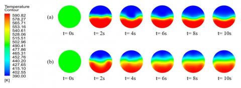 Figure 9 showed the comparison of the steady-state temperature contour of the RANS model [30] and the k-ε model by the present study. The results by Ming and Zhao [30] showed a better resolution of temperature segregation with a sharp boundary in between hot and cold water while the k-ε model showed a more dispersed and blurry temperature boundary. Both mixing outlets had a similar temperature of 320 K or 47℃ but the RANS model showed a slightly higher temperature.