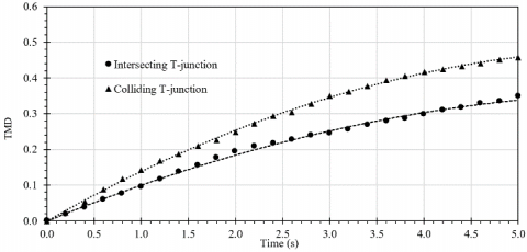 Variation of TMD or thermal mixing efficiency for colliding and intersecting mixing tee sampled at 3d distance at different time steps is shown in Figure 22. Here again, it is apparent that the TMD for a colliding tee is always consistently higher than intersecting tee at different timesteps. It is also found that TMD is time-dependent; it increases with the increase of time.