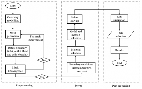 The numerical simulation consisted of three main steps: namely pre-processing, solution procedures, and post-processing. The pre-processing included geometry modelling, mesh generation, boundaries/surfaces definition, mesh independence test, etc. Normalized temperature at mixing region is used as the ultimate criterion for mesh convergence test. If the mesh is convergent, it will go to the next step. If the mesh is not convergent, then it will return to mesh generation step for mesh improvement to generate a fine mesh. The solution procedure included selecting the appropriate CFD model, material, prescribing boundary conditions, solver, etc. In post-processing, calculated numerical solutions were extracted and subjected to further manipulation to obtain the desired outcome. A brief flowchart for the entire CFD numerical procedure is shown in Figure 2.