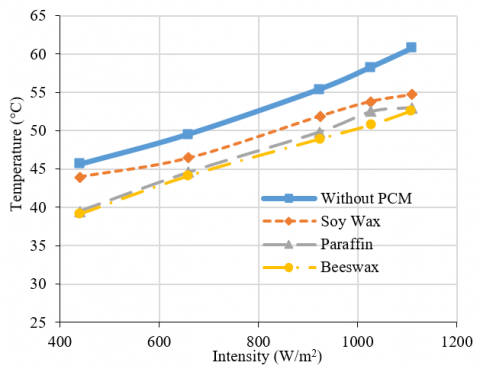 High PV operating temperatures directly affect PV performance [5]. The purpose of PCM is to reduce the PV's extremely high-temperature rise to increase PV efficiency. According to earlier studies, PV with PCM used as passive cooling performs better than PV without a cooling system [9, 10, 35]. Figure 4 depicts how intensity affects PV temperature. PV panels with paraffin, PV panels with soy wax, and PV panels with beeswax are the variants that were employed in this experiment.