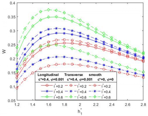 By varying the surface roughness parameter c* in Figure 5, the load increases with transversal roughness and decreases with longitudinal roughness. The lubricants fill the valleys and ridges of the surface which is rough allowing the lubricants to stay there for a longer time than compared with the smooth solid backing. This accumulation of lubricant helps to carry more load than in the smooth cases and thereby reduces the coefficient of friction between the sliding surfaces.