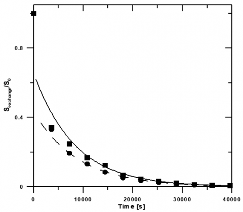 $\frac{k_m}{k_{m 0}}=\frac{S_0}{S_{\operatorname{exch}}} \frac{\left(\rho_{\text {surf }}^v-\rho_{\infty}^v\right)_0}{\left(\rho_{\text {surf }}^v-\rho_{\infty}^v\right)} \exp (-\alpha t)$ (9)
