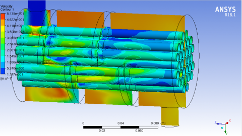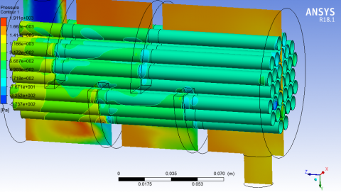The pressure distribution plot is obtained across mid-section plane of the EGR cooler with 4 coolant inlet as shown in Figure 14. The pressure magnitude is uniform for flue gas tubes. For the water tube, the pressure is higher at the 1st tube and 4th tube as shown in green colored contour with a magnitude of 7.98Pa. The pressure at the outlet is 3.02Pa.