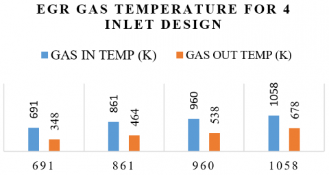 The research findings highlight the remarkable effectiveness of employing CFD simulation and the k-omega turbulence model to assess the flow behavior and thermal characteristics of EGR coolers. By incorporating additional coolant inlet tubes, the performance of the EGR cooler is significantly enhanced, with the four-inlet design consistently surpassing the single-inlet design across various operating temperatures. Particularly noteworthy is the four-inlet design's remarkable 0.02 higher effectiveness compared to the single-inlet design at an operating temperature of 1058K, while the pinnacle of effectiveness is achieved at 691K.