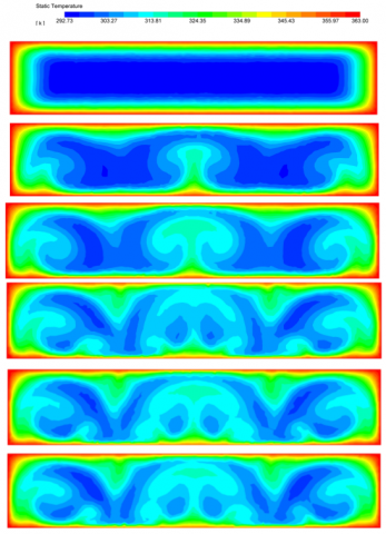 Achaichia and Cowell [2] detailed performance metrics of flat tube and louvered fins spanning Reynolds numbers from 120 to 8000, transitioning from laminar to turbulent flow. It was discerned that high Reynolds numbers favored a flow parallel to the louvers, whereas lower Reynolds numbers resulted in a flow dictated by the geometry of the louvers. At reduced Reynolds numbers, the shift from a flat plane to channel flow was noted, with laminar flow velocities hovering around 0.5 m/s.