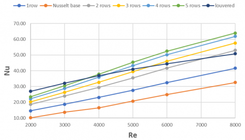 It was noted that the performance of louvered fins diminishes markedly as the inlet velocity escalates. Consequently, for elevated velocities (specifically when Re surpasses 4000), alternative methodologies such as the incorporation of LVGs are recommended. Beyond their application in the current context, LVGs have been suggested for potential utility in other domains to amplify passive heat transfer, especially within solar energy systems. Their efficacy, however, hinges on the appropriateness of their arrangement.