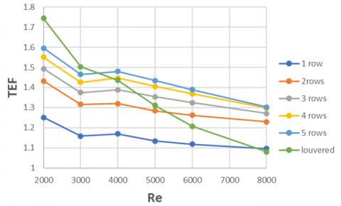 Figure 15. TEF delineated across various LVG configurations and for louvered fins