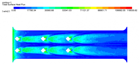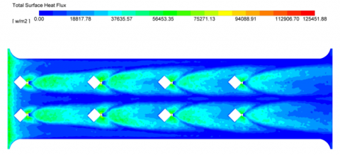 As illustrated in Figure 4, the boundary conditions and computational domain are clearly delineated. The air inlet temperature, Tin, was fixed at 293 K, while the flat cylinder region had its temperature set to Twall=363 K. The inlet velocity, U, ranged from 8.63 [m/s] to 34.52 m/s, corresponding to Reynolds numbers spanning from 2000 to 8000. The fins, constructed of aluminum, exhibited a thickness of 0.1 mm. In this region, the conduction model provided by the software ANSYS [14] was utilized.