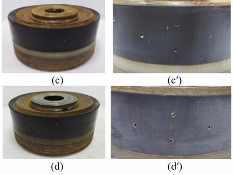 Figure 2. Comparative analysis of piston wear under thermodynamic scrutiny: (a) No.1 standard piston; (b) No.2 pitted piston; (c) No.3 pitted piston; (d) No.4 pitted piston. (a′, b′, c′, d′) are detailed enlargements of (a, b, c, d)