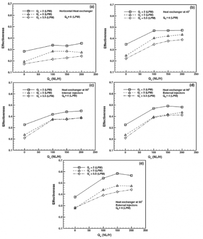 The influence of air bubble injection on the performance of a horizontal helical shell and coiled tube heat exchanger were investigated experimentally by Khorasani and Dadvand [18]. In this regard, the influences of variable air flow rates on NTU, exergy loss, and efficacy were examined. Figure 3 specifies significant increases in the heat exchanger's efficacy and NTU as a result to injecting the air bubbles. It is fair to admit that the migration of air bubbles has enhanced the disruption and the instability strength of the shell side flow. This in turn has resulted in an increase in exergy loss and NTU. Furthermore, the bubbles' mixing impact and connectivity to the thermal boundary layer can raise the velocity (and consequently the Reynolds number (Re)) of the shell side flow.