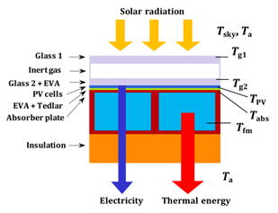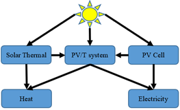 Photovoltaic-Thermal (PVT) systems, as depicted in Figure 1, amalgamate photovoltaic (PV) and thermal (T) components to concurrently generate electrical and thermal energy. This dual-functionality of PVT solar cells facilitates a more efficient conversion of total solar energy, thus enhancing the overall performance of solar energy systems [10, 11]. However, one notable challenge arises from the heat that is trapped within the photovoltaic cells, which they are incapable of converting into electrical energy. This accumulation of heat elevates the temperature of the cells, leading to degradation and a subsequent drop in photovoltaic performance. In PVT systems, this detrimental heat is strategically redirected from the photovoltaic cells via a collector into a solar water heater. This process not only reduces the operating temperature of the photovoltaic cells, thereby increasing their efficiency, but also ensures that the radiation and radiant heat intensity is maintained. The redirected heat can then be repurposed for water heating, further enhancing the system's energy efficiency [12-14].