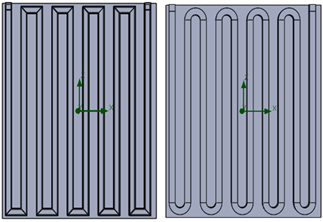 The modeling process followed the configuration shown in Figure 2(a). computational fluid dynamics (CFD) simulations were conducted on the collectors using water flowing at a rate of 0.00005 m³/s. The viscosity and other properties of the water were determined based on the research conducted by Ni et al. [34]. The collector was designed with a square shape of 15.77×15.77 mm and a thickness of 1.95 mm, and a thin plate was added with a thickness of 0.4 mm, as shown in Figure 2(b). The number of collectors modeled in this study was 5, 10, and 15, taking into account the proportional composition between the dimensions of the panel and the cross-sectional area of the collector. In addition, the selection of edge angles of 90° and 180° applied represents the most commonly used forms in thermal collector schemes. This research aims to examine the heat transfer phenomena and flow rates occurring in each variation used to enhance solar cell performance.