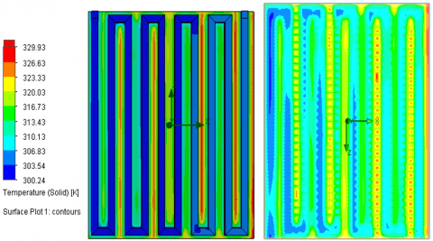 At various numbers and angles of collector edges, the simulation results are shown as temperature contours throughout the collector domain. Figure 4 depicts the contour of the temperature collector with an edge angle of 90° while Figure 5 depicts the contour of the temperature collector with an edge angle of 180°. It is well known that temperature contours are lower and more consistent the more collectors there are. A high temperature is denoted by the red contour, whereas a low temperature is denoted by the dark blue contour.
