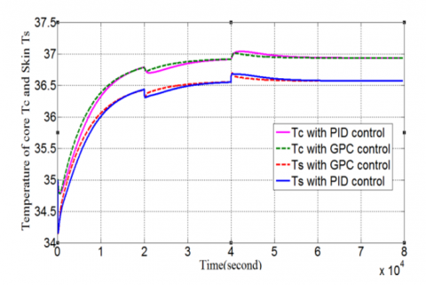 Figure 2. Skin temperature of infant against operational time with utilising GPC and PID control [35]