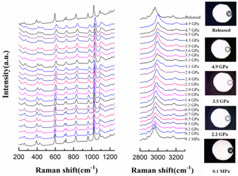 Figure 2 further presents the Raman spectra of [Emim][CF3AcO] following pressure release, alongside micrographs depicting the sample cavity under various pressures. It was observed that no discernible crystallization occurred within the sample cavity throughout the experimental procedure. Moreover, upon depressurization to ambient pressure, the Raman spectra of the sample exhibited recovery, closely resembling the spectra obtained under ambient conditions. This consistency suggests that [Emim][CF3AcO] maintained its chemical stability and did not undergo crystallization even after being subjected to pressures of approximately 5 GPa.