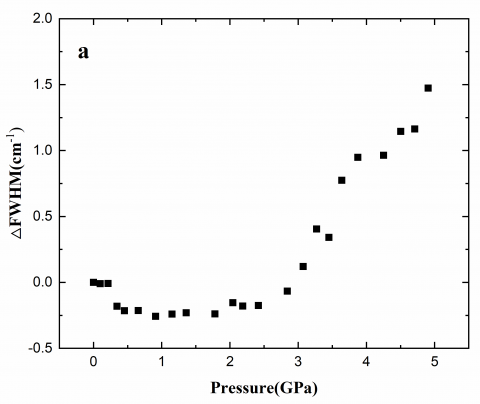 Considering that [Emim][CF3AcO] is in a liquid state at atmospheric pressure, a transition to a solid state under high pressure would alter the sample chamber from a hydrostatic to a non-hydrostatic environment. Typically, the hydrostaticity of the sample cavity can be determined by two methods: 1) Variation in the FWHM of the ruby R1 line as a function of pressure [20], and 2) The differential between the peak positions of ruby R1 and R2 lines (R1-R2) as a function of pressure [21]. The pressure point at which an increase in these parameters is observed is identified as the glass transition pressure (Pg). Accordingly, Figure 5 analyzes the deviation in FWHM of the ruby R1 line under high pressure from its ambient pressure value, as well as the R1-R2 differential under varying pressures. In Figure 5(a), below 2.8 GPa, a slight decrease in the FWHM difference value of the ruby R1 line was noted. Beyond 2.8 GPa, this difference value continued to increase, displaying an inflection point around 2.8 GPa. This observation suggests that the IL [Emim][CF3AcO] likely underwent a glass transition near 2.8 GPa.