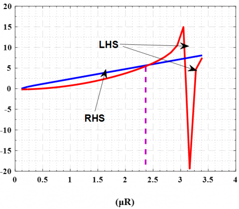 After plotting the functions LHS and RHS in Figure 4, as a function of (μR), one can observe the linearity and flatness of the RHS rather than the LHS, as the LHS is (Cot function)*. Over the range values of (μR) as shown in the figure, this property of linearity is not a common specification of the RHS function. After limiting the intersection points of the RHS with LHS, one can note that the first intersected point happened at: