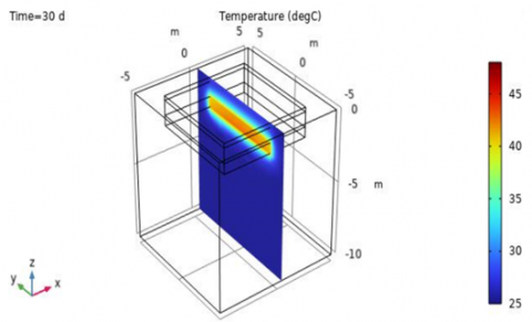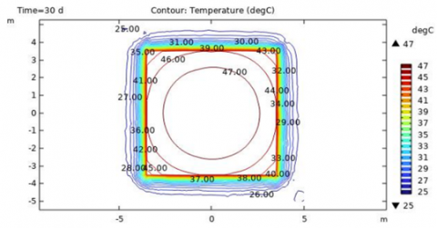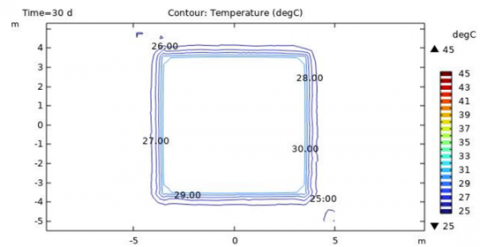 Figure 8. Temperature cantour at horizontal cutplane z=-2m corresponding to solar pond bottom