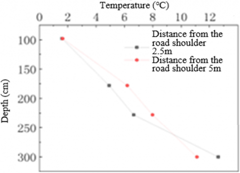Comparing the cut section and the fill section, the temperature lines in the cut section are more numerous and inclined, indicating that at the same depth, the temperature is higher near the road shoulder than near the center of the road, and there is a greater temperature difference within a depth range. In contrast, the temperature lines in the fill section are fewer and more horizontal, indicating that the temperature difference is not significant both laterally and vertically.