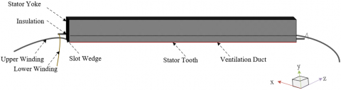 In the process of constructing the CFD simulation model for the temperature field of the synchronous condenser, the loss conditions of each component and heat source loading need to be clarified first. Based on the loss values under the operating conditions of 500 r/min and 500 Nm, these losses will be used as heat sources in the temperature field model to ensure that the simulation can accurately model the thermal behavior of the synchronous condenser under actual operating conditions. Specifically, the stator copper loss is 6530 W, which is applied as the main heat source in the model, while the winding ends have more significant temperature rise due to poor heat dissipation conditions. To further improve simulation accuracy, the initial temperature of the model is set to 20℃, representing the initial thermal state of the synchronous condenser under stationary or low-load conditions. The coolant used is water, with an inlet temperature also set to 20℃, and a flow rate of 8 L/min, simulating the cooling effect in actual operation. The simulation runtime is set to 1000 seconds to observe the temperature changes of the synchronous condenser over a short period. During the simulation, considering the temperature effects on the materials, the temperature-induced change in stator copper loss is 6%, but the overall change is relatively small, indicating that the impact of temperature effects on losses is relatively low under this operating condition.