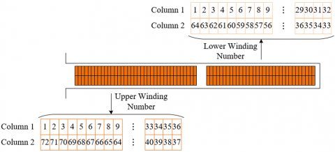 Copper loss is primarily caused by the Joule heat generated when current flows through the copper windings, and its magnitude is proportional to the current strength and resistance. The resistance of the copper windings increases with rising temperature, which means that, for the same current, copper losses will rise significantly at high temperatures. Therefore, when calculating copper loss, the impact of temperature on the resistance of the copper windings must be considered. The temperature coefficient of resistance for copper is known and describes the effect of temperature changes on resistance. Typically, the resistance value of copper at standard temperature can be corrected using the temperature coefficient. In the process of thermal loss calculation, the resistance value of the copper windings at different temperatures needs to be first calculated, then combined with the current intensity, and the thermal loss in the copper windings is determined using Joule’s law. Figure 1 shows the copper loss calculation model. Figure 2 shows a schematic of the winding numbering. Assuming the number of winding phases of the synchronous condenser is represented by l, the effective current of the winding phase is represented by U, and the effective resistance value of each winding phase is represented by E, the calculation formula is: