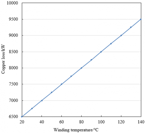 From the above temperature characteristic analysis, it is known that during the operation of the synchronous condenser, copper losses are mainly influenced by the winding resistance and the current passing through the windings. According to the known copper loss formula, when the current remains constant, copper loss shows a positive correlation with the winding temperature. This is because as the temperature increases, the resistance of the copper windings increases, causing more electrical energy to be converted into heat energy, thus increasing copper losses. By using interpolation in finite element simulations, copper losses can be expressed as a function of winding temperature, further providing a basis for the quantitative analysis of the temperature effect on copper losses. Under different operating conditions of the synchronous condenser, especially at high speeds and under high load conditions, the copper winding temperature may increase significantly, which directly affects the system’s thermal management and efficiency.