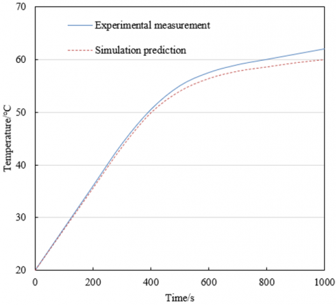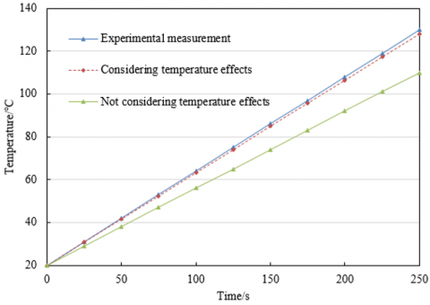 From the data in Figure 4, the temperature trend of the synchronous condenser with respect to time under two different speed conditions shows a certain similarity, but also obvious differences. For the 500 r/min condition, the experimental measurement results show that the temperature starts from the initial 20℃ and gradually increases with the operating time, reaching about 61℃ at 1000 seconds, while the simulated temperature data at this time is 59.4℃. The temperature change trends of both are consistent, with a maximum temperature difference of 1.6℃. This difference indicates that the experimental and simulation results are consistent to some extent, but the simulation results are slightly lower than the experimental data, possibly due to differences in actual cooling effects and material parameters. For the 1200 r/min condition, the experimental measured temperature is significantly higher over time, increasing from 20℃ to 130℃, while the simulated temperature, considering the temperature effect, reaches 128℃, which is very close to the experimental data. Without considering the temperature effect, the simulation temperature is slightly lower, around 110℃. This shows that the temperature effect has a significant impact on the system's temperature rise, especially at higher speeds, where considering the temperature effect can more accurately reflect the actual operating temperature. Based on the comparison and analysis of the experimental data and simulation results, it is evident that speed and temperature effects have a significant impact on the synchronous condenser’s temperature rise. At the 500 r/min low-speed condition, the temperature change trends of the experimental and simulation results are consistent, proving that the temperature rise is mainly influenced by stator copper losses and winding heat dissipation, and the simulation model can effectively predict this process. However, at the 1200 r/min high-speed condition, the temperature rise is significant, and the experimental results and simulations considering temperature effects show little difference, indicating that temperature effects are more pronounced on the equipment performance under high load and high-speed conditions. In particular, when calculating losses, the temperature effect cannot be ignored.