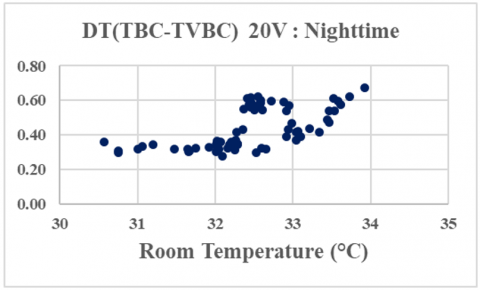 To make subjective comparative analysis, ensure accuracy and reproductivity of the performance of the VBC with field tests conducted under different days and variable ambient conditions, we define the ventilation efficiency of the VBC as the calculated temperature difference between non-ventilated and ventilated built-in closet (DT(TBC-TVBC)) plotted versus room temperature. Figure 5 shows the scatter of the efficiency of the VBC for the different ventilation rates considered during daytime (top) and nighttime (bottom).