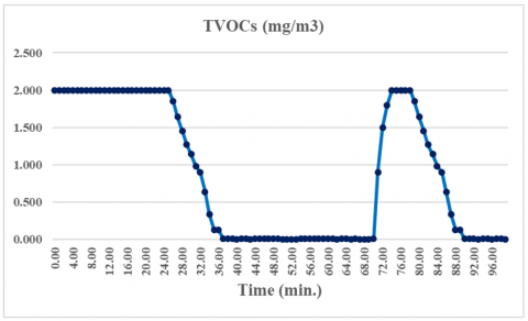 Figure 6. The variations of TVOCs versus time of the VBC with two cycles of fan switched OFF and ON