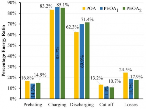 The comparison for energy ratio is plotted in Figure 8. The drawback of a longer preheating causes the effective energy ratio for POA becomes unfavorable. Also, the heat losses due to slow heat releasing (Figure 2) increases notably which makes some of the stored heat cannot be discharged. It makes the effective discharge ratio for PEO extremely low. The composite PEOA has a sufficient operation behavior (Figure 7), indicating a positive trend for the overall operation, especially for the effective discharge. It makes the maximum heat losses can be lowered to 17.9%, making more energy can be extracted from the material. It is advisable to ensure a higher discharge ratio to maintain the energy balance of the HSS unit, making the system more effective to store and release energy. Therefore, the synthesized composite material for HSS makes the operation of the system becomes effective and improving the net energy balance.