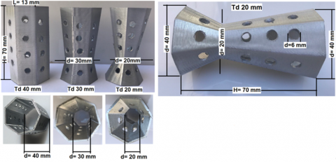 The test apparatus consisted of a 1350 millimeter long, 50 millimeter inner diameter and 1.5 millimeter thick copper pipe. To reduce heat loss, the conveyor (pipe) is shielded with a 25-millimeter thickset asbestos cord. New turbulators were connected to the surface of the inward conveyor. Moreover, the turbulator is formed from metallic element (aluminum) as manifested in Figure 1. The length of the turbulator is designed to be 70 millimeters. An 800-watt group heater was joined to the exterior surface. A variable converter was used to control the power output at constant heat flow, which was induced in the experimental part of the heat converter. On the other hand, A blower 250 W was used to blow air through the test section, and the surface temperature was controlled by connecting eighteen k thermocouples at different points along the test section. Two thermocouples were placed at the inlet and outlet of the conveyor to mark out the temperature of the inlet and outlet air. Temperatures around the examination segment and air temperatures at the inlet and outlet were documented continuously. To detect the descent in pressure and evaluate the friction constant, the pressure valves of the inlet and outlet test section are connected to a digital manometer. Air flow rates were measured using a valve and orifice meter. The test apparatus is shown in Figure 2. The turbulator elements used in this work are heptagonal, each side is 13 mm and 70 mm high. 6 mm diameter holes were made on all faces. Two of the turbulators ones have a waist 20 mm away from one end, one of them has a waist diameter of 20 mm and the other 30 mm, while the third has no waist, as shown in Figure 1 and technical details shown in Table 1. Experiments were conducted in two stages for each of the turbulators. In the first stage, four turbulators were placed inside the tube, with a distance of 214 mm between them, resulting in a pitch ratio (PR) of 4.28, where PR equals the length of the distance between the turbulators divided by the diameter of the test section PR=L⁄D=214⁄50=4.28. While in the second stage, six pieces of turbulators were placed with a distance of 155 mm between them, resulting in a pitch ratio (PR) of 3.1. For each stage of the experiments, the temperature readings of the air entering and exiting the tube were recorded. The average temperature of the tube surface was calculated using eight thermocouples fixed to the tube surface. The pressure drop was also recorded for each reading by digital manometer. The data was then collected and calculations were made based on the equations shown in data reduction.