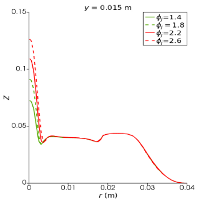 ϕj =1.4, 1.8, 2.2, 2.6. Tj=309 K, Uj=105 m/s, Rej=18550, Lt=1.5×10-3. |