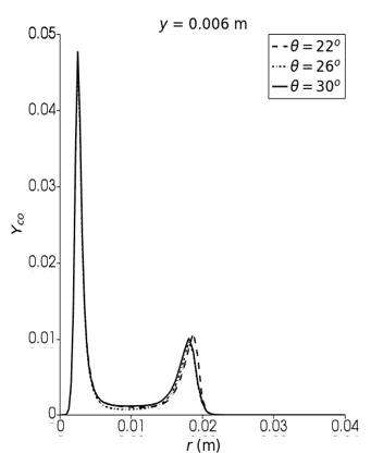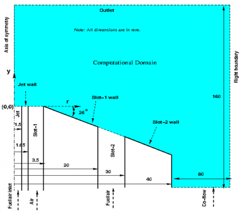 In the present study, the nature of the averaged flow field is axis-symmetric [11, 12]; which allows consideration of a wedge two-dimensional, axis-symmetric computational domain for numerical simulations as shown in Figure 2. Where, the various dimensions of the computational domain are shown in mm. The origin (r=0, y=0) of the computational domain is placed on the axis of symmetry, at the exit of the central jet. The computational domain consists of the premixed outer reaction zone, recirculation zone, and lifted inner reaction zone. In order to lower the computational cost, only half of the burner was chosen as the computational region. The burner is placed at a sufficient distance away from the right boundary and outlet, as depicted in Figure 2. In order to reduce the numerical error associated with boundary conditions. The computational domain’s right and outlet boundaries are exposed to the atmosphere, maintaining a gauge pressure of zero. Zero-gradient boundary conditions are applied to temperature, velocity, and species concentrations. The domain features four in- lets: jet, slot-1, slot-2, and co-flow, where specific fuel-air mixtures are introduced through the jet and slot-2 at predefined velocities. The pressure over the wall and inlet of domain are treated with zero gradient boundary condition. The boundary conditions are discussed in Table 2.