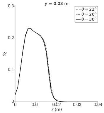 where, Y and W are elemental mass fractions and atomic weights of (H), carbon (C), and oxygen (O) respectively. This process allows for the calculation of accurate measurements in the field of chemistry. The subscript 1 refers to the fuel stream, and 2 relates to the air stream. The progress variable quantifies the advancement of a specific location in the combustion zone during the reaction, leading to faster simulations while accurately predicting combustion behavior. The progress variable ($Y_C$) is defined as the sum of CO2 and H2O mass fractions is being discussed in previous studies [29].