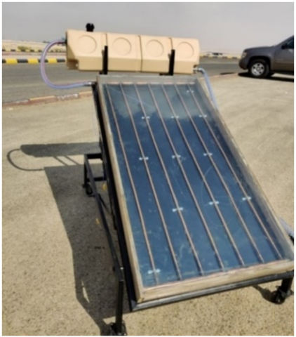 Burning of fossil fuels is the main cause to many environmental issues including global warming, acid rains and draught. The rising of global demand for energy, coupled with the declining supply of fossil fuels and the associated environmental concerns, has significantly driven the global concerns on renewable energy sources [1-3]. Solar energy can be considered as a one of the most abundantly available type of renewable energy sources in developing world [4, 5]. In addition, solar energy is clean renewable energy source [1, 6], it has variable applications, including direct use for water heating, power generation, and space heating and cooling [7, 8]. Another utilization method of solar energy is by converting the electromagnetic energy of sun's light into direct electric current by using of photovoltaic cells [7]. The geographical location of the kingdom of Saudi Arabia (KSA) is in the middle of Arabian Peninsula with a latitude line between 32oN and 17oN and longitude lines between 56oN and 28oN [9, 10]. The studies conducted on KSA renewable energy potential in KSA showed a high potential in solar energy [9-11], whereas the mean value for the annual solar radiation in KSA is 2200 kWh/m2 [9]. In addition, the annual average daily Global Horizontal Irradiation (GHI) values in Saudi Arabia is varying between 5700 Wh/m2 and 6700 Wh/m2 while the annual mean value of daily Direct Normal Irradiation (DNI) is varying between 4400 Wh/m2 and 7300 Wh/m2 with the maximum values in the northwest part of the country [9]. Solar energy research in KSA dates back several years, with initial planned investigations into solar energy systems launched by the King Abdulaziz City for Science and Technology in 1977 [12]. Recently, numerous studies on using of flat plate collectors were conducted in KSA. Nejlaoui et al. [13] developed a six sigma optimization for flat plate collector with an uncertain designing parameters for material, geometer and environment conditions for Qassim area. The collected results showed that the flat plate collector design presents 31% sensitivity based on efficiency and 27% sensitivity when considering the total cost. Khedher [8] has investigated experimentally the effect of varying water flow rates on flat plate collector efficiency. The collected results confirmed a maximum water tank temperature of 82.5℃ which was achieved at water flow rate 2.5 L/min. Another investigation on the flat plate system performance under different water flow rates was performed by Al-Ajlan et al. [14]. In this work, the investigation was focused on an active water heating system that uses flat plate solar. The collected results were derived from a simulation study, and the simulated outcomes were compared with experimental results collected from a flat plate collector in Riyadh's climate. The collected results from the simulation study and experimental investigation was with in good agreement. The effect of inlet flow condition on the efficiency of the FPCs was studied by Alobaid et al. [15]. The collected results in this work were validated from literature. Flat plate solar collectors are a widely used type of solar thermal collector that transforms solar energy into heat. FPCs are simple in design, they consist of a flat, dark-colored surface that absorbs solar radiation. This heat is then passed on to a circulating fluid, typically water or antifreeze, which can be used for various applications [16]. Flat plate collectors (FPCs) are considered as one of the cheapest and most desirable equipment for water heating for domestic use. In passive (FPCs), water circulation can be accomplished naturally where water flows due to density differences and convection current [1]. Although the relatively high efficiencies associated with passive (FPCs), high temperatures are very difficult to be achieved with such systems due to poor water circulation associated with natural convection [1], other reasons limit the system to achieving high temperature for instance, flat plate collectors have a relatively simple design, which can lead to significant heat losses. These losses which caused by conduction, convection, and radiation, decrease the overall efficiency of the collector [17, 18]. Also design limitations, the design of flat plate collectors often involves a simple absorber plate and a glazing layer, these components may not be able to withstand extremely high temperatures without degrading or failing [7, 19, 20]. Achieving of high temperature is very important parameters in several solar heating applications such as water desalination and water heating for domestic use purposes. Different methodologies can be implemented to achieve higher temperatures in FPCs such as using of concentrating techniques [21, 22], using of Nano-fluids [23, 24] and using of active FPC systems [16, 25]. As compared with FPC active systems, using of concentrating techniques and Nano-fluids to improve the FPCs performance can be considered relatively expensive, where additional materials and space may require. Active FPCs systems use an external pump to circulate the water inside the system, which would affect in improve of the heat transfer coefficient, and hence an increase in water temperature is expected. On the other hand, additional power is needed to run the pump in active FPCs, which in turn would reduce the overall efficiency. The commonly available active FPCs are use electric pump to move the water within the collector which reduce the overall system's efficiency and increase the cost. Use of small size PV solar pump to circulate water in FPCs would give an opportunity to improve the performance of such systems without consuming an electric power.